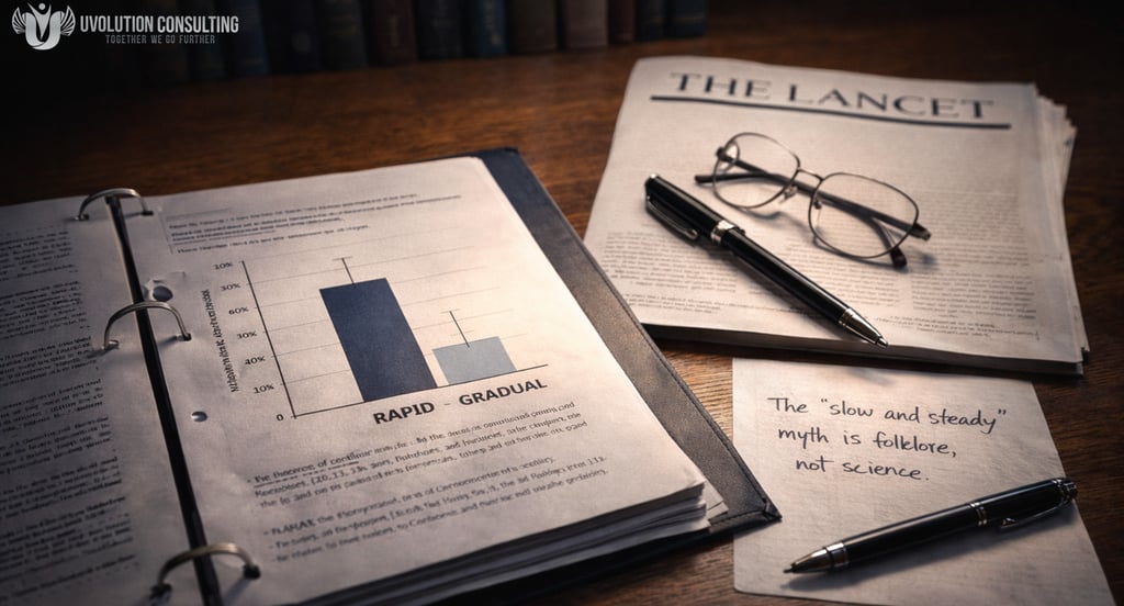 In an editorial responding to this study, Dr. Corby Martin and Professor Kishore Gadde of Pennington Biomedical Research Center wrote something remarkable. They compared the belief that gradual change is superior to the tortoise-and-hare fable, a children's story. Their point was sharp: we've been operating on folklore, not science. The fable says slow and steady wins. The data says otherwise.